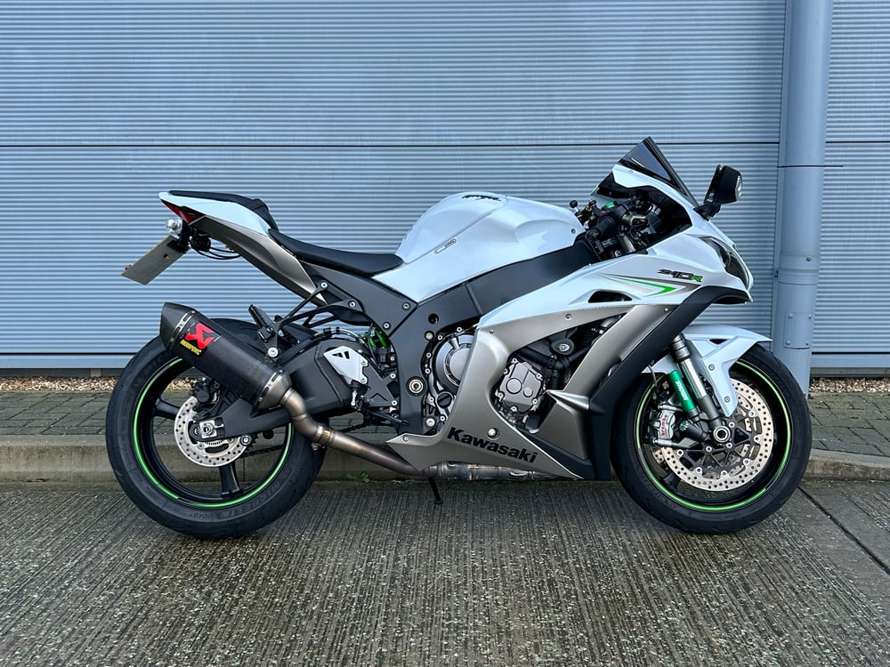 The 2018 Kawasaki Ninja ZX-10R in white is a high-performance superbike that sits at the top of the 1000cc class, known for its direct lineage to World Superbike Championship-winning technology. 998cc inline-four supersport featuring 197.3 bhp at 13,000 rpm and 113.5 Nm torque. It features a 6-speed cassette transmission, Brembo M50 monobloc calipers, and Showa Balance Free suspension. Bosch IMU (6 Degrees of Freedom), Kawasaki Cornering Management Function, Electronic Throttle Valves, Launch Control, and Quick Shifter. Bike also comes with, Powerbronze screen, R&G radiator guard, paddock stand bobbins, crash bungs, tail tidy, Akrapovic exhaust and tank pad. Bike will come with a 3 month warranty.